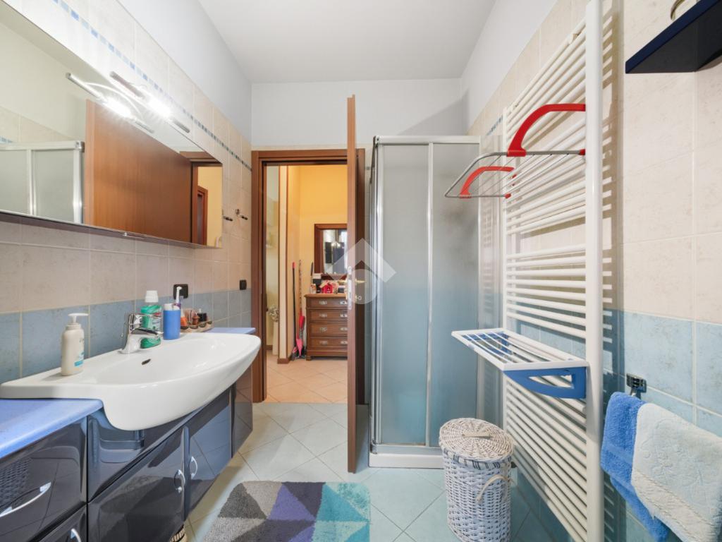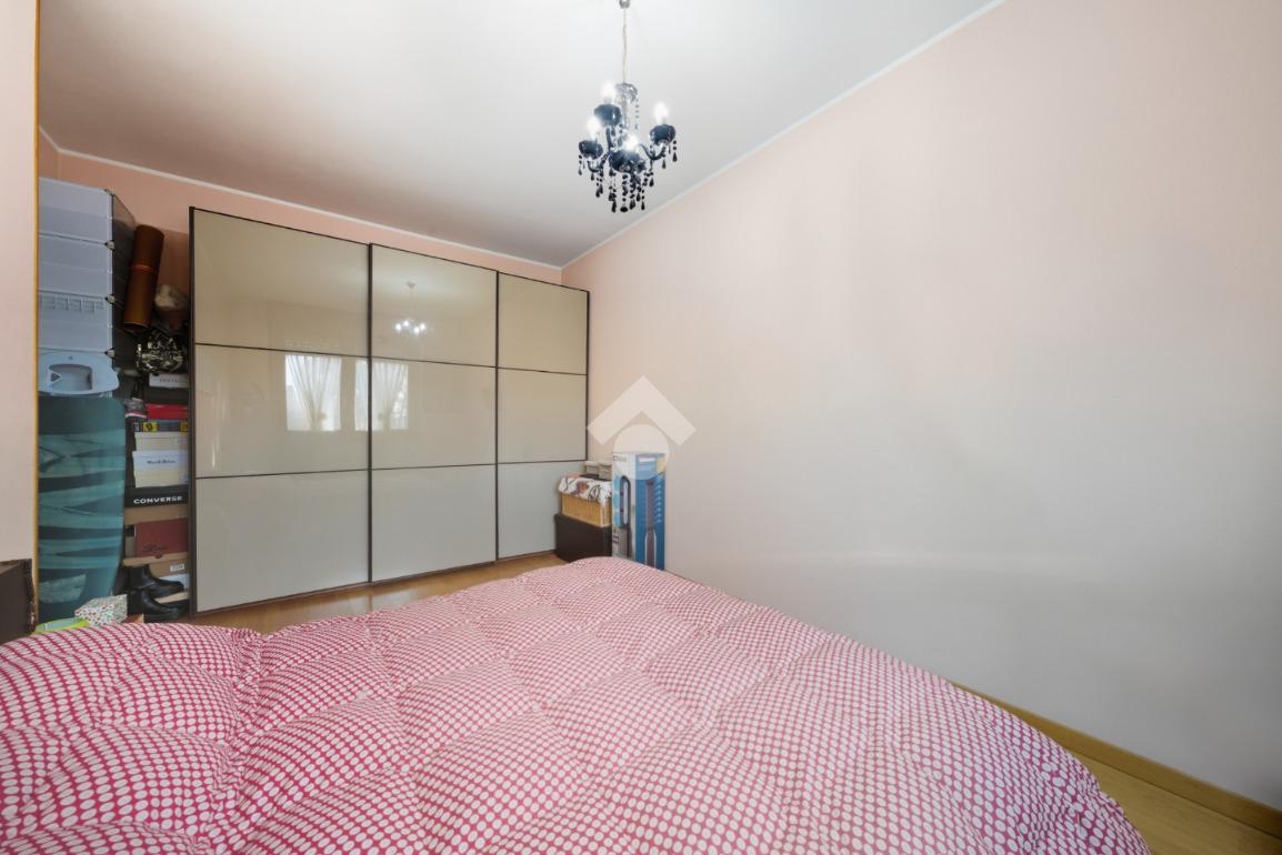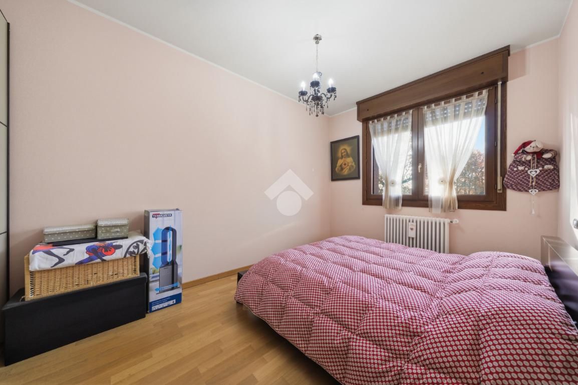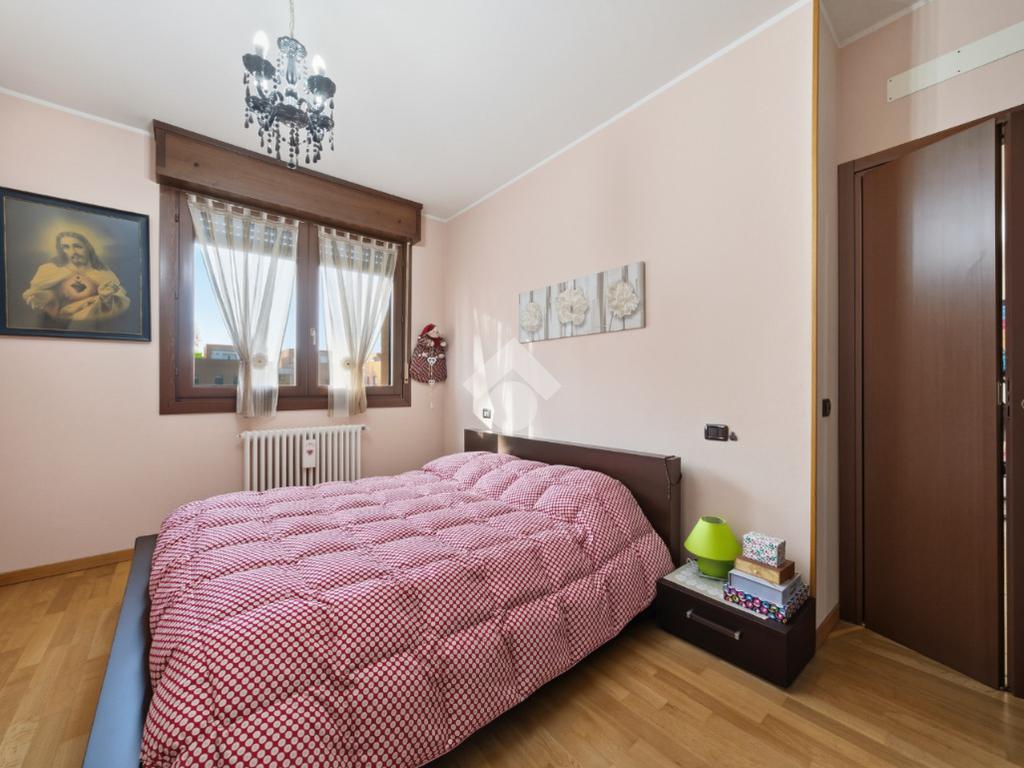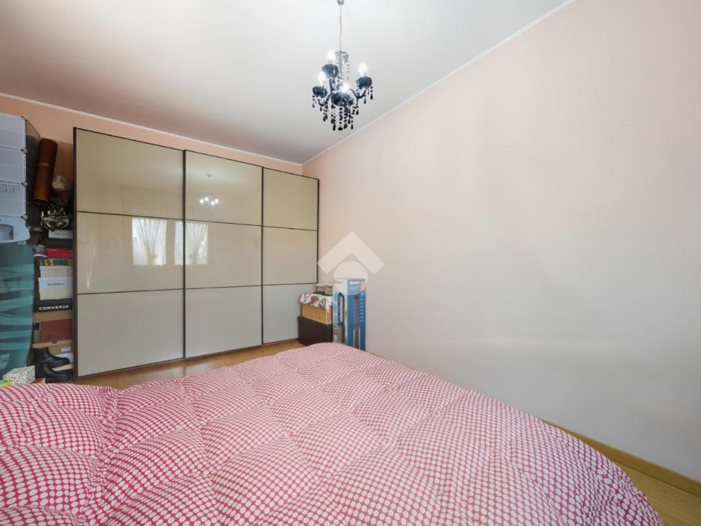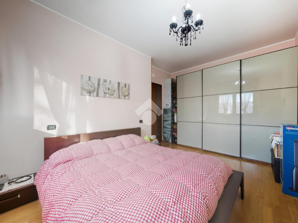La zona notte comprende una camera da letto matrimoniale luminosa pavimentata con parquet in legno e un bagno moderno con box doccia.